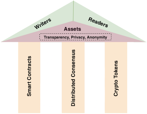 In terms of the relationship among these components, the writers and readers on top are external to the blockchain and the bottom pillars are internal to the blockchain platform. The assets in the center are the linkage between these two groups. The transparency, privacy, and anonymity requirements of the transactions come from the external use case properties but are fulfilled by the internal blockchain platform. Let us examine the different components.