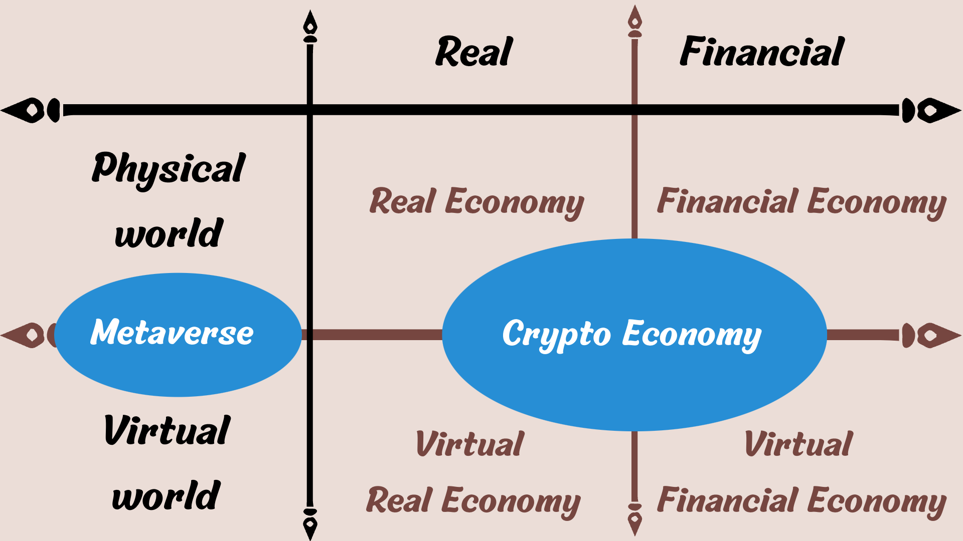 Both the real economy and financial economy sectors, whether physical or virtual, may integrate with crypto. Crypto is a vital force propelling the fusion of these different types of economies. The result of this process is a hybrid economic form that blends real and financial assets both in the physical and virtual world, also known as Metaverse economy. While there have been many activities in the virtual financial economy sector, a lot more developments in the virtual real economy sector need to be made in order to advance the metaverse economy agenda.